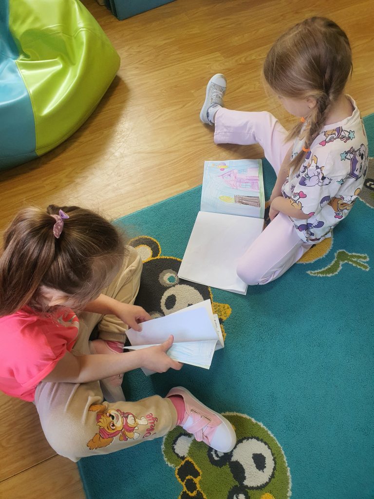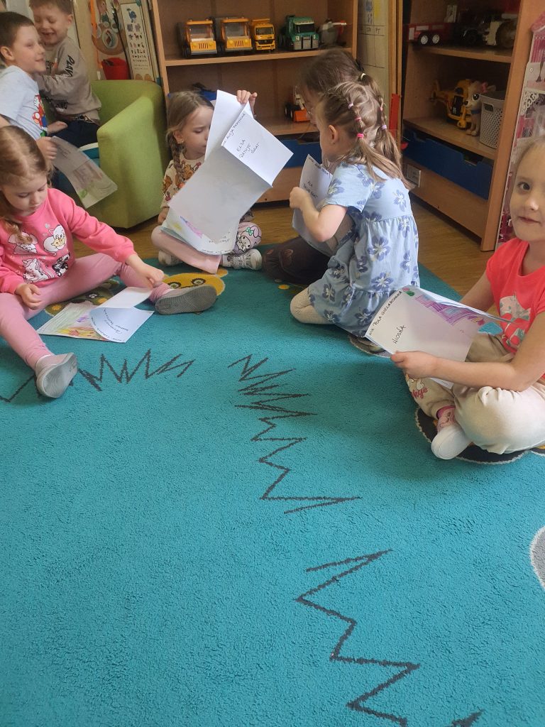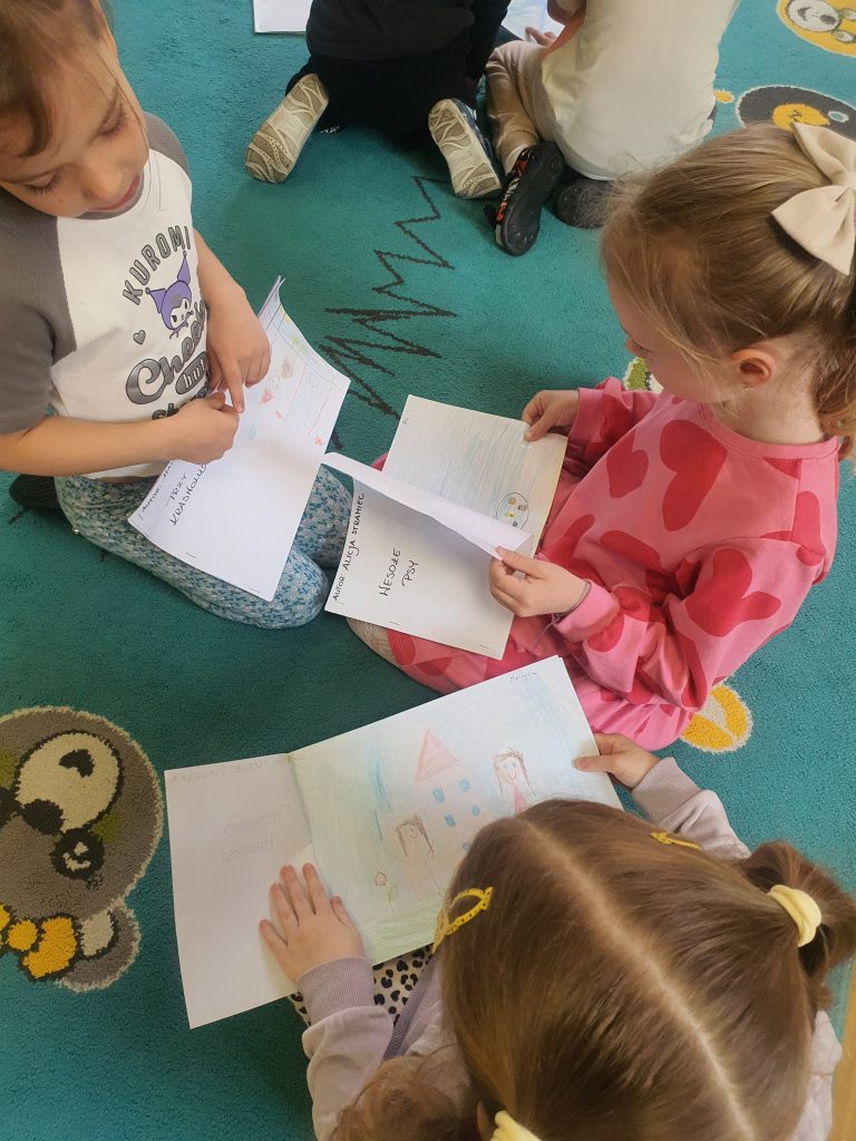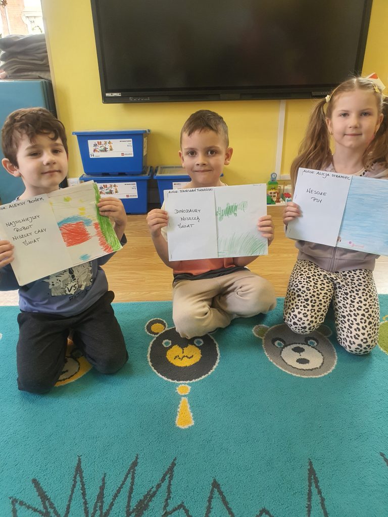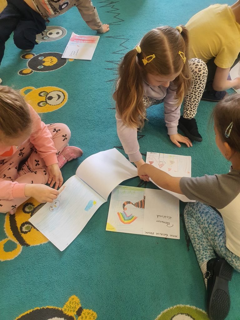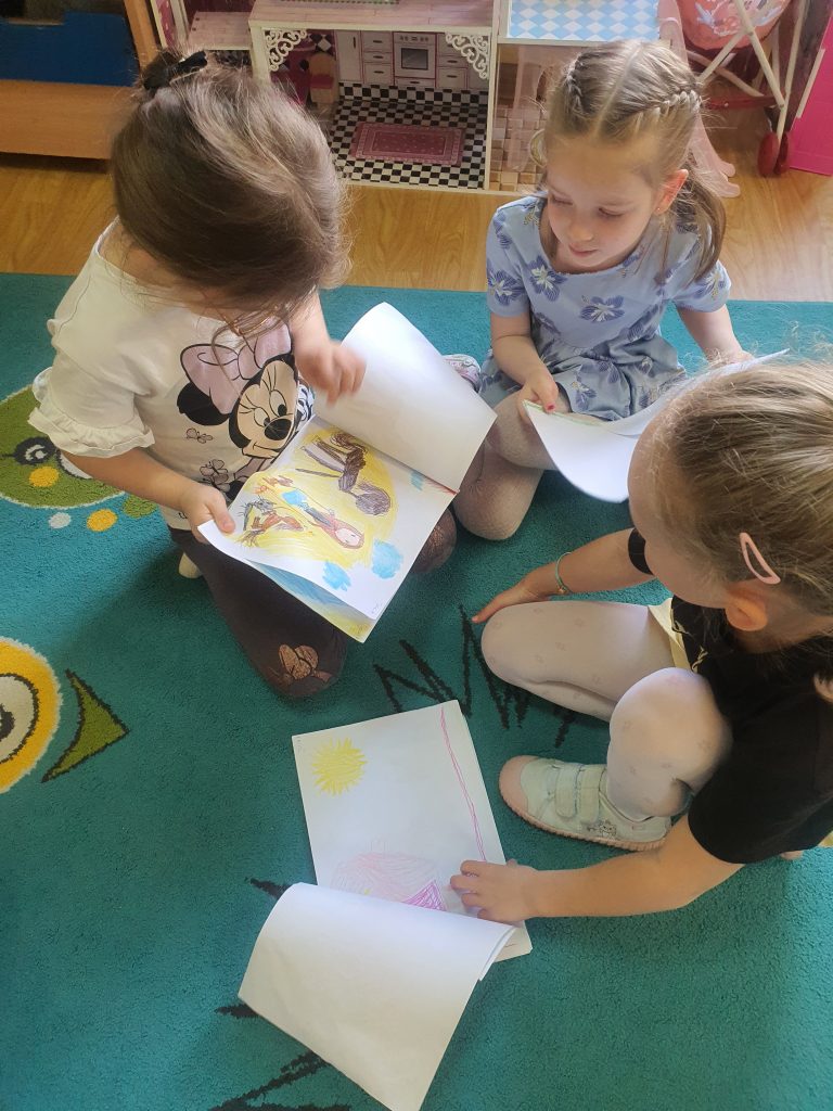 W tym tygodniu rozmawialiśmy o książkach a dzieci tworzyły przez cały tydzień swoją autorską książkę. Dzisiaj książki zostały złożone, dzieci mogły je pooglądać i podzielić się swoimi pomysłami z innymi.