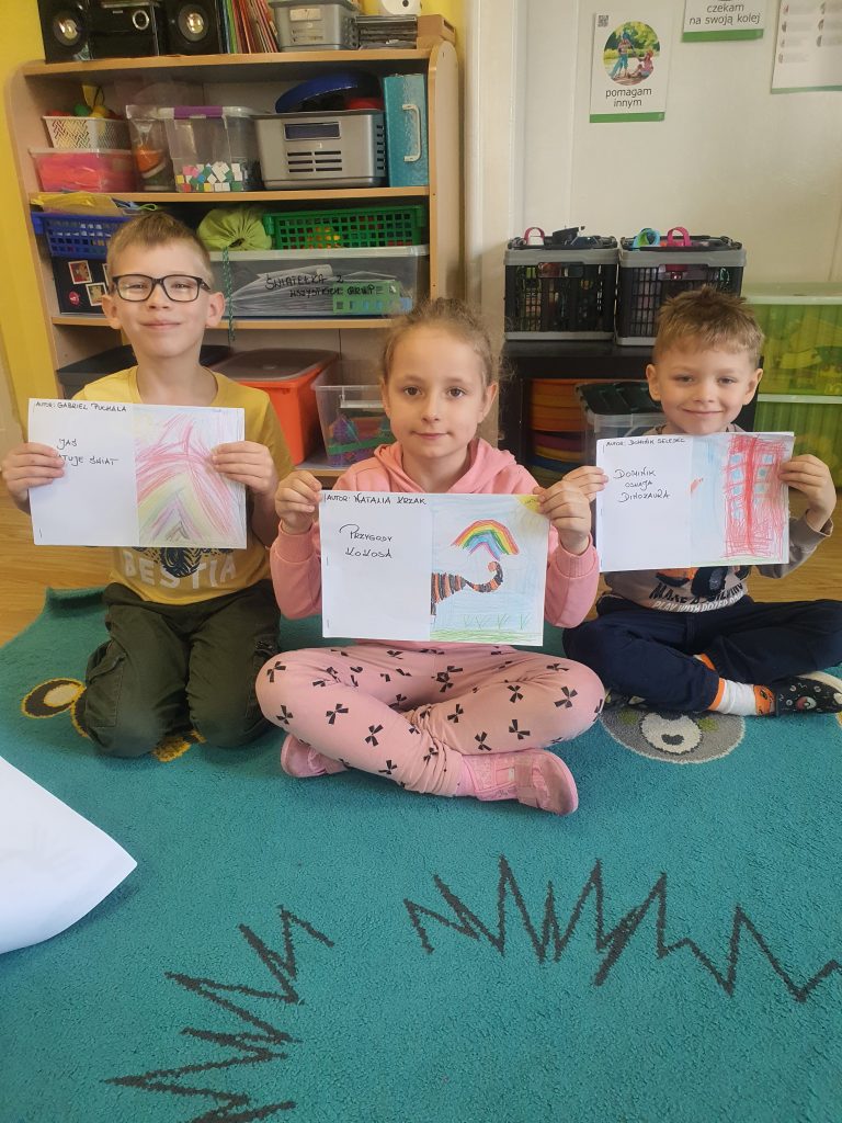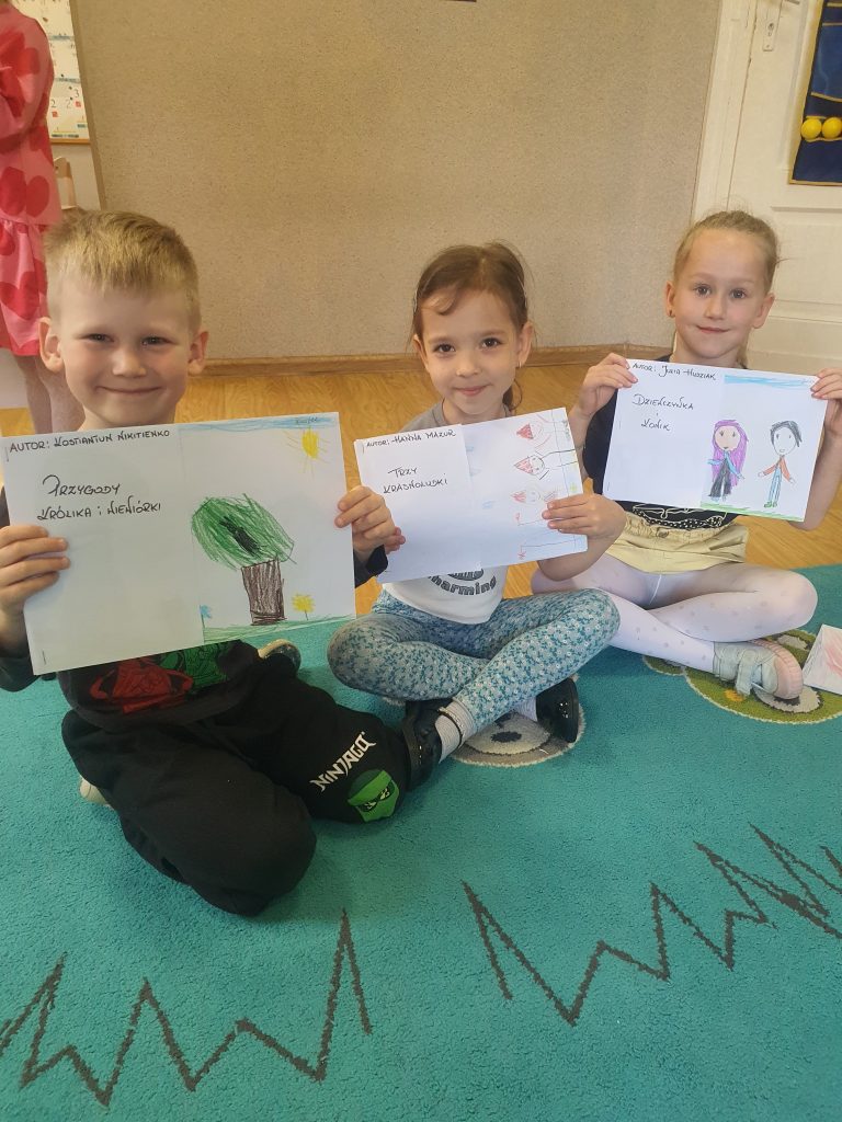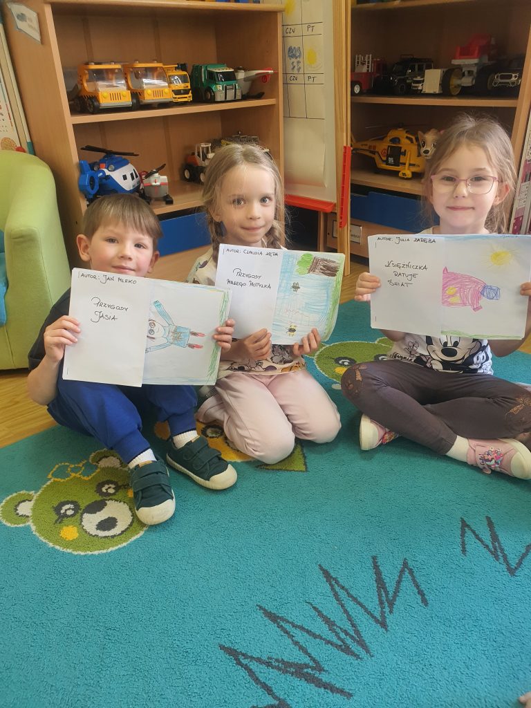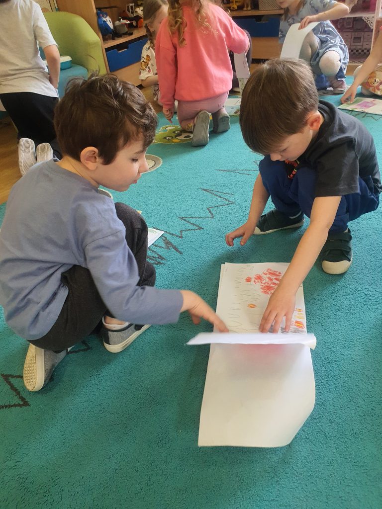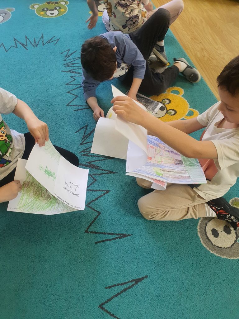 W tym tygodniu rozmawialiśmy o książkach a dzieci tworzyły przez cały tydzień swoją autorską książkę. Dzisiaj książki zostały złożone, dzieci mogły je pooglądać i podzielić się swoimi pomysłami z innymi.
